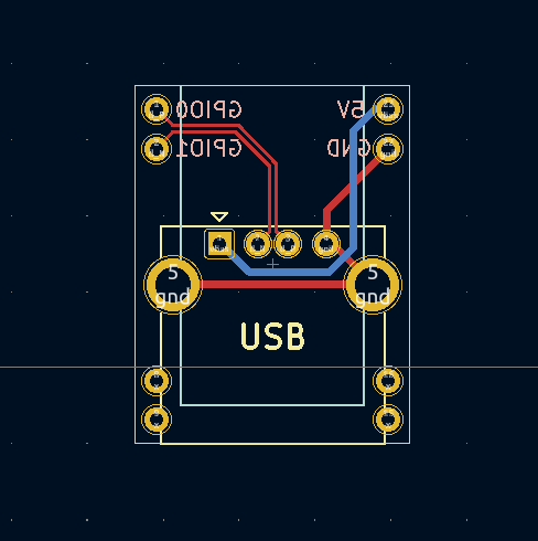 空中配線でも良いですが、今回はPCBGOGOさんよりプリント基板のご提供を頂いたので以下のようなマイコンボードとUSBコネクタを接続する基板を作成してみます。RP2040-Zeroの7, 8, 14, 15ピンに対応するスルーホールは基板固定用で配線はしていません。